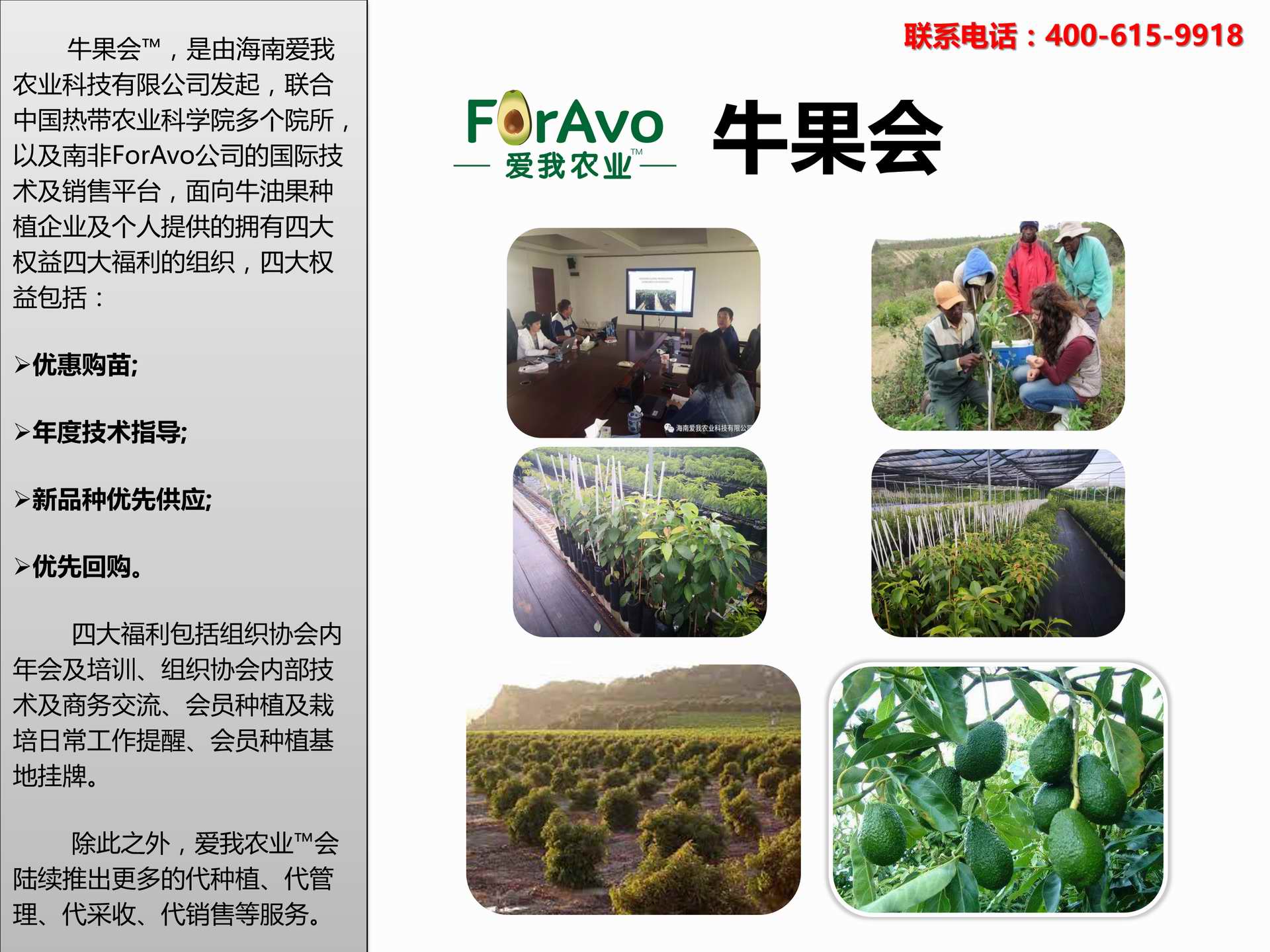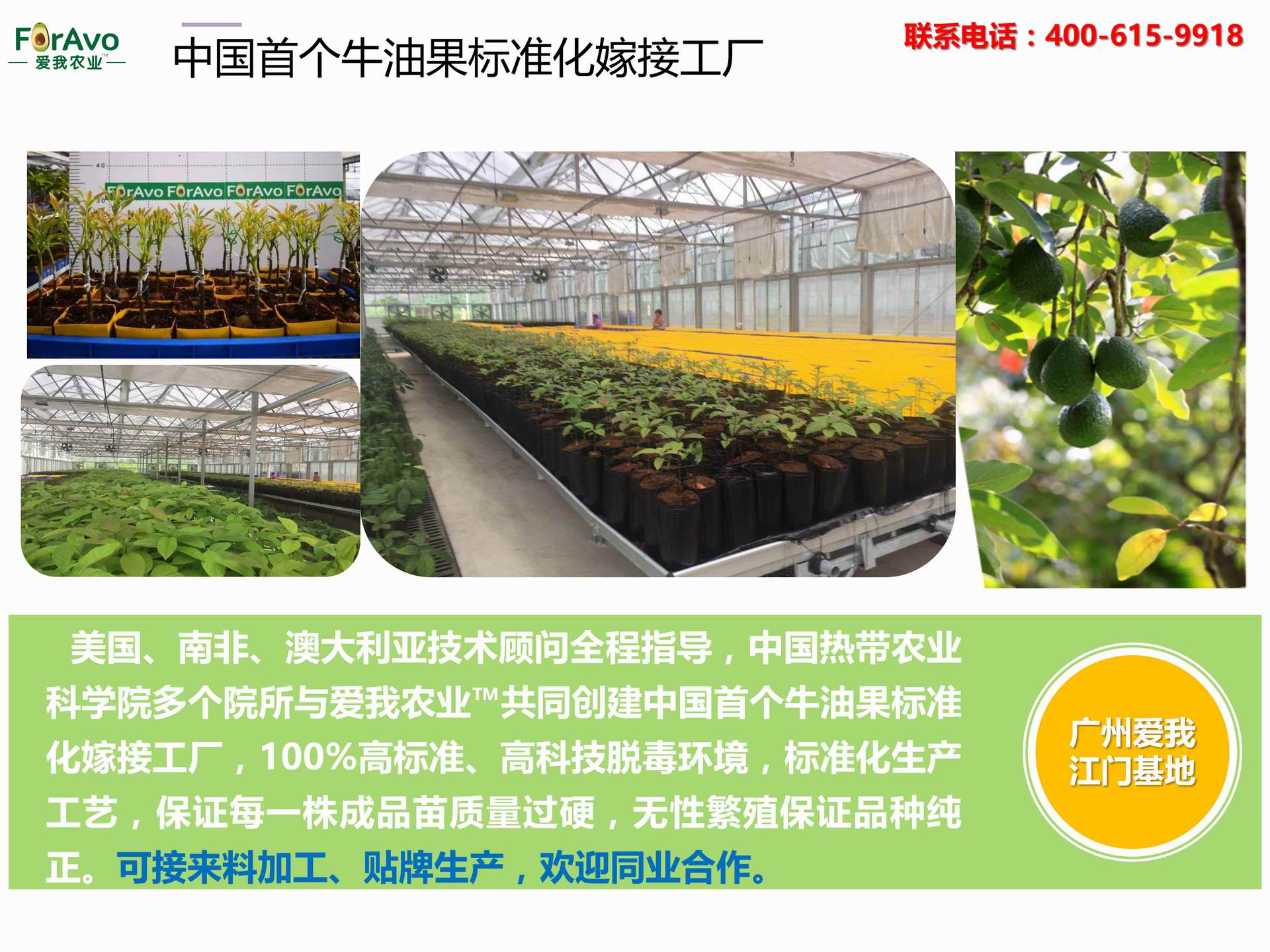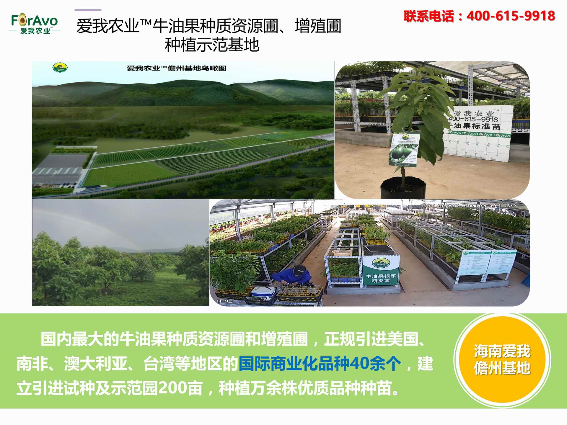 海南愛我農(nóng)業(yè)科技有限公司是一家綜合性的高科技農(nóng)業(yè)發(fā)展企業(yè),旗下愛我農(nóng)業(yè)TM致力于打造中國最大最強的牛油果種植企業(yè)。依托美國、南非、澳大利亞等擁有百年牛油果繁育、種植歷史以及產(chǎn)業(yè)鏈?zhǔn)袌龅膬?yōu)勢,開展牛油果種苗繁育、種植技術(shù),種植加盟、深加工等產(chǎn)業(yè)。結(jié)合中國市場,面向廣大苗圃基地、種植農(nóng)場、合作加工等企業(yè),推出的適合規(guī)模化、標(biāo)準(zhǔn)化的牛油果全產(chǎn)業(yè)鏈服務(wù)。 Hainan Foravo Agricultural Technology Co., Ltd. is a comprehensive high-tech agricultural development enterprise , dedicated to building the largest and most powerful avocado plantation enterprise in China. Relying on the advantage of avocado nursery, planting history, and the industrial chain over 100 years in the United States, South Africa, Australia, we are carrying out nursery, planting, proce...